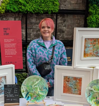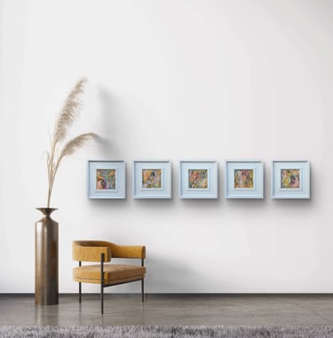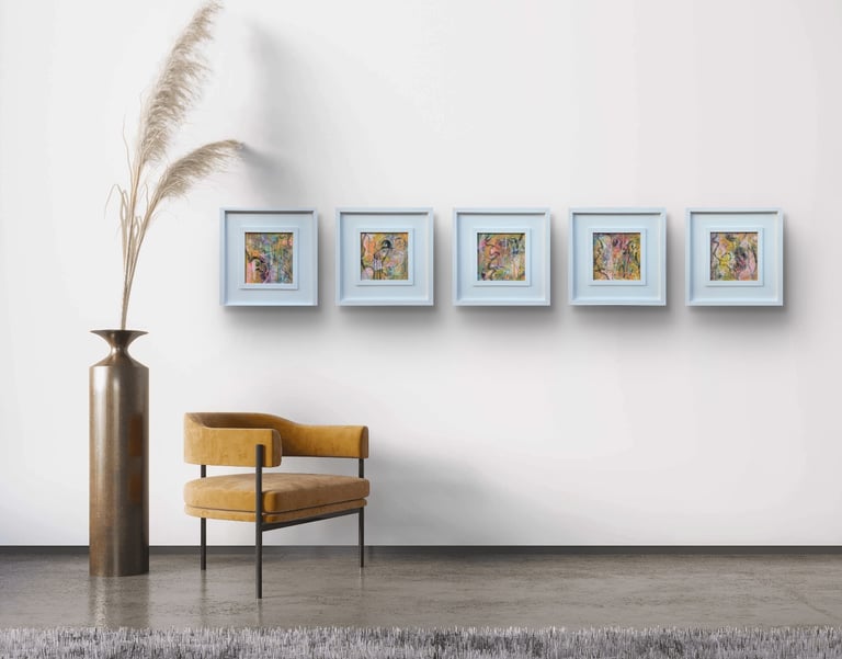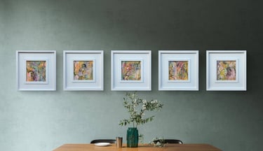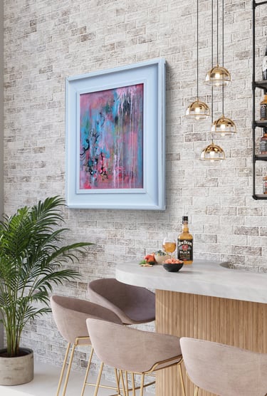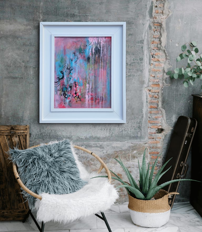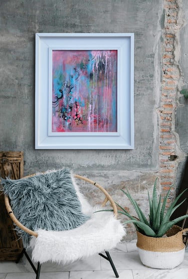 'Secret Garden' is a joyous place to take your mind for a wonder, enjoy the waltz of pinks and blues, in layered depths that invite the eye to meander and linger. Playful drips and swirling gestures allow your imagination to float off into a place of quiet and hidden delight.